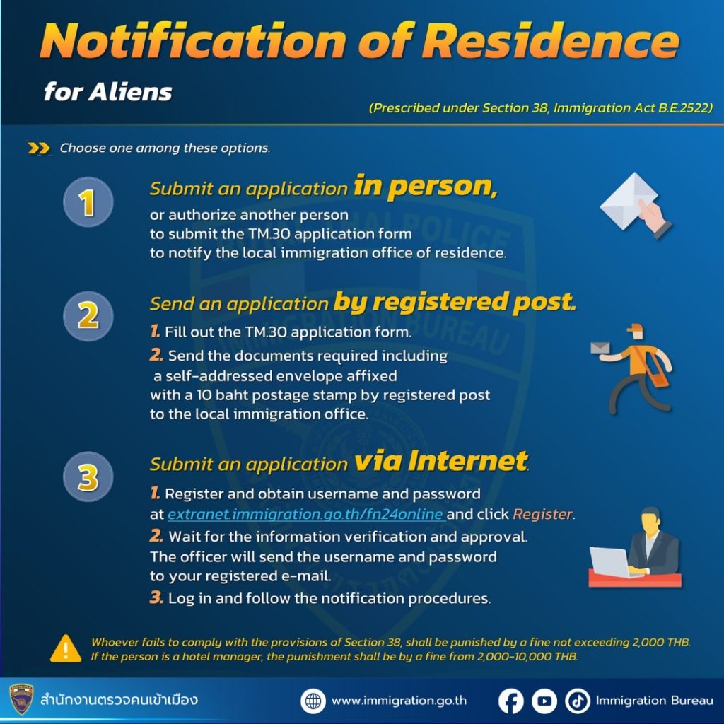 House owners, landlords, or property managers must notify the immigration office when a foreigner resides at their premises.
