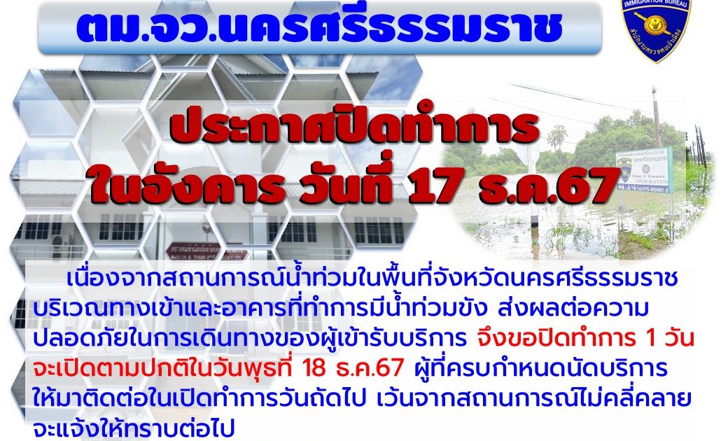 ประกาศปิดทำการ ในอังคาร วันที่ 17 ธ.ค.67 17 ธันวาคม 2024 โดย admin / ข่าวประชาสัมพันธ์,ข่าวฝากประชาสัมพันธ์,งานอำนวยการ,ผลการปฏิบัติ ตม.จว.นครศรีธรรมราช,งานอำนวยการ ธ.ค.67