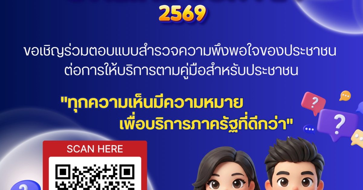 สำนักงาน ก.พ.ร. ขอเชิญร่วมตอบแบบสำรวจความพึงพอใจของประชาชนต่อการให้บริการของหน่วยงานของรัฐ ปี พ.ศ. 2569 เพื่อประโยชน์ในการพัฒนาบริการภาครัฐและอำนวยความสะดวกแก่ประชาชน โดยสามารถแสดงความเห็นได้ตั้งแต่วันนี้จนถึง 31 สิงหาคม 2569 ได้ที่ลิงก์