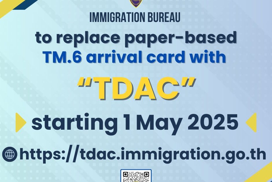 Immigration Bureau to replace paper-based TM.6 arrival card with TDAC 5 เมษายน 2025 โดย admin / ข่าวประชาสัมพันธ์,ข่าวฝากประชาสัมพันธ์ Immigration Bureau to replace paper-based TM.6 arrival card with TDAC starting 1 May 2025 Registration through: https://tdac.immigration.go.th Instructions for Using a TDAC: https://www.youtube.com/watch?v=QSEoVloM5A0