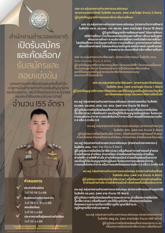 รับสมัครตำรวจ 155 อัตรา สามารถศึกษารายละเอียดเพิ่มเติมได้ที่ http://policeadmission.jobthaigov.comht