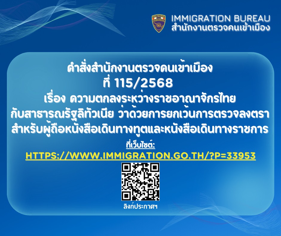 คำสั่งสำนักงานตรวจคนเข้าเมืองที่ 115/2568 เรื่อง ความตกลงระหว่างราชอาณาจักรไทยกับสาธารณรัฐลิทัวเนียว