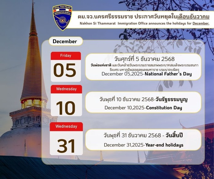 แจ้งวันหยุดประจำเดือน ธ.ค.68